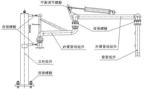 鶴管主要部件有:連接螺栓、平衡調(diào)節(jié)螺栓、立柱組件、連接螺栓、內(nèi)臂管線組件、外臂管線組件、垂直組件